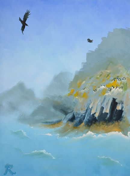 Choughs flying in the thermals. Commissioned by RSPB Cymru for Anniversary of owning and managing Ramsey island, St David's, Pembrokeshire.